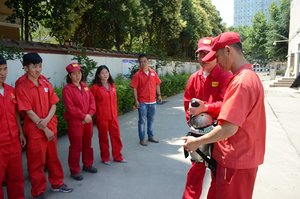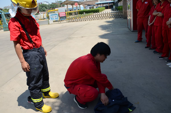 三、门站站长赵凯、闫晓晨现场讲解和演示消防服的正确穿戴方法。